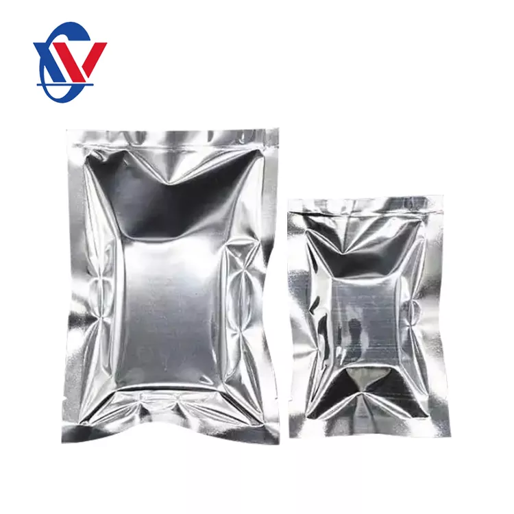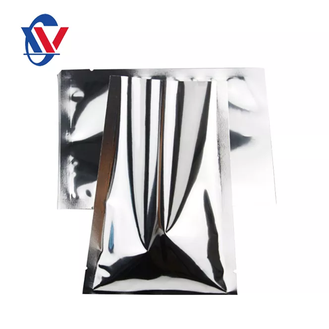 Salah satu sisi kantong kemasan aluminized adalah film transparan, dan sisi lainnya adalah film buram dari aluminized atau aluminium foil. Komposisi materialnya biasanya termasuk PET+PE (film vakum) atau PE+PA (film vakum nilon) sebagai sisi transparan, sedangkan sisi lain terdiri dari PET+Al+PE (aluminium foil) atau PET+Al+CPP (foil aluminium tahan suhu tinggi) atau film aluminized PET+PE.