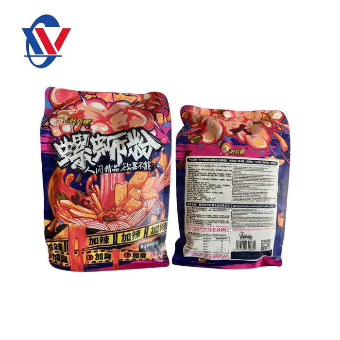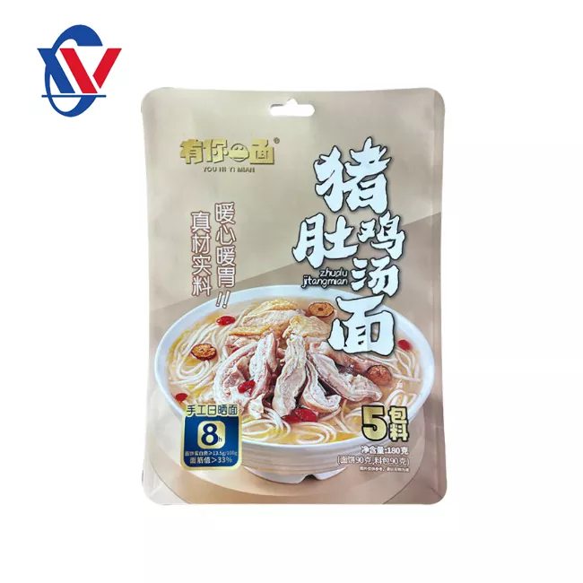 Tas kemasan mie beras biasanya terbuat dari film komposit plastik dan film komposit aluminized. Film gabungan plastik memiliki ketahanan penyegelan dan kelembaban yang baik, yang secara efektif dapat memperpanjang umur simpan makanan; Film komposit aluminized memiliki sifat tahan cahaya yang baik dan dapat mencegah makanan memburuk karena cahaya. Selain itu, beberapa tas pengemasan juga menggunakan desain yang menebal untuk memberikan perlindungan dan portabilitas yang lebih baik.